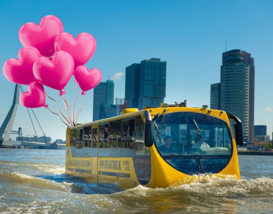 De bus blijkt ineens ook een zeewaardige boot die verder op het water langs de spectaculaire skyline van de stad vaart! Een live gids vertelt je alle ins en outs en leuke anekdotes over Rotterdam en de bezienswaardigheden.